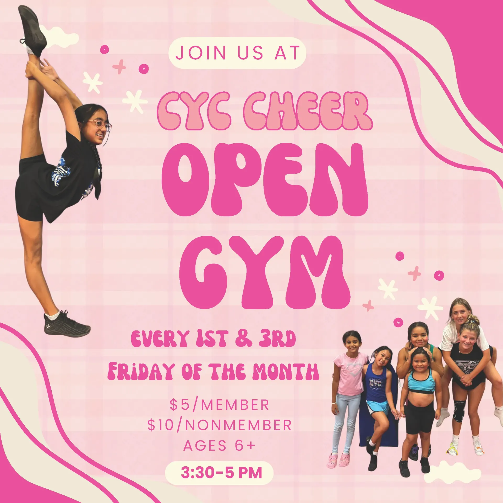 Come join us every 1st and 3rd Friday of the Month for Cheer's "Open Gym"